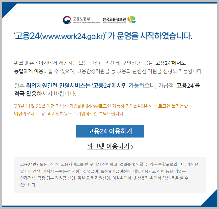 결과적으로 이제는 WORKNET보다는 고용24를 이용하기를 권합니다. 이곳은 고용노동부와 한국고용정보원이 운영하는 통합 포털사이트입니다. 이 포털은 워크넷, HRD-Net 등 기존의 여러 관련 사이트를 하나로 통합하여, 구직자와 기업 모두에게 편리하고 효율적인 서비스를 제공합니다